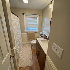 In the remodel, we installed a brand-new tub/shower unit, sleek vanity, updated toilet, and efficient fan/light combo. The flooring was updated with durable vinyl, providing both aesthetic appeal and easy maintenance.