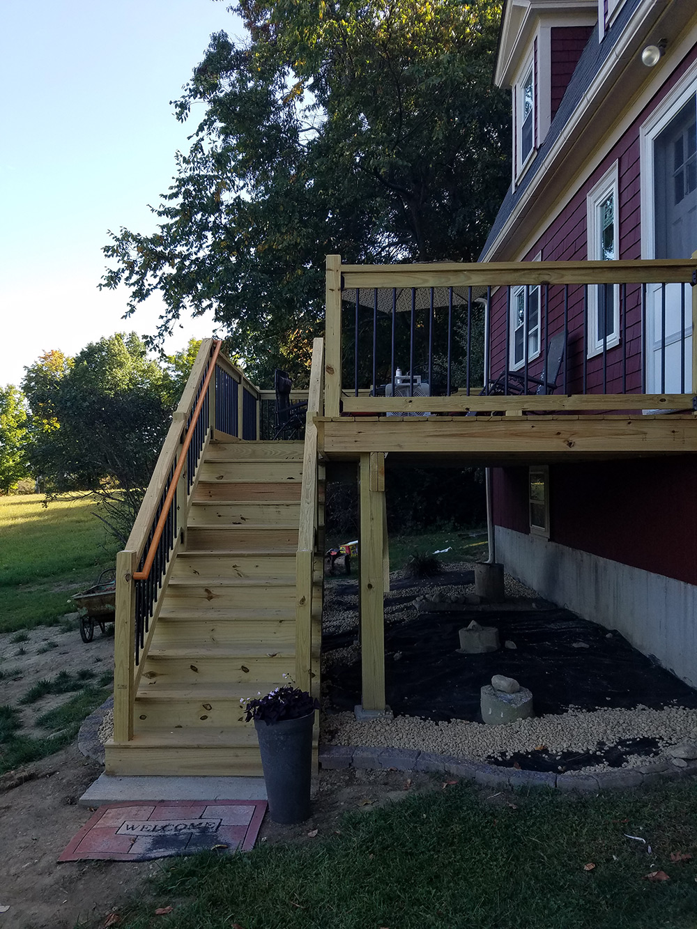 This pressure treated deck was built for a family looking to create an open outdoor leisure space in Sterling, MA. The project took about a week to for our remodeling experts to complete and the deck was built using pre-cast concrete footings, pressure treated lumber, and aluminum balusters. We also replace windows in this house with Harvey Classic replacement windows.